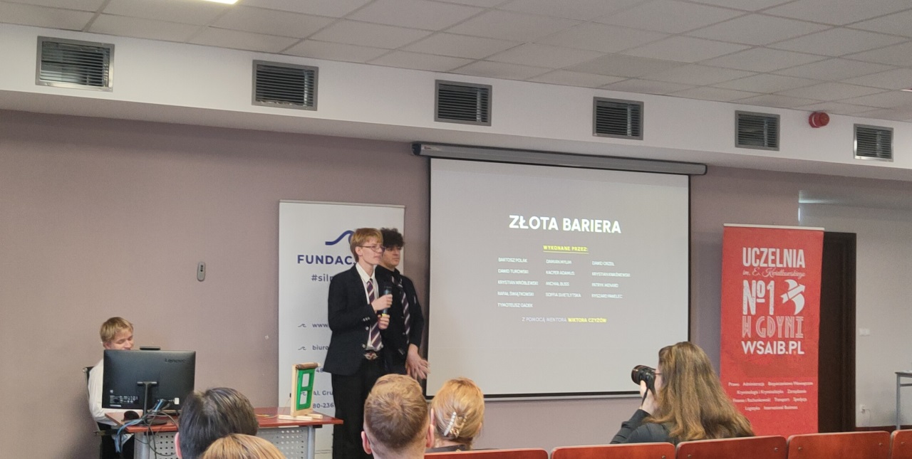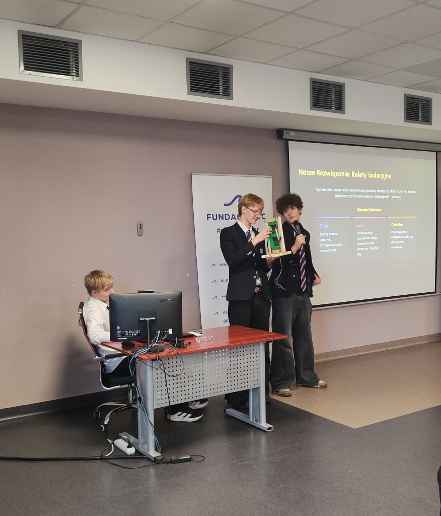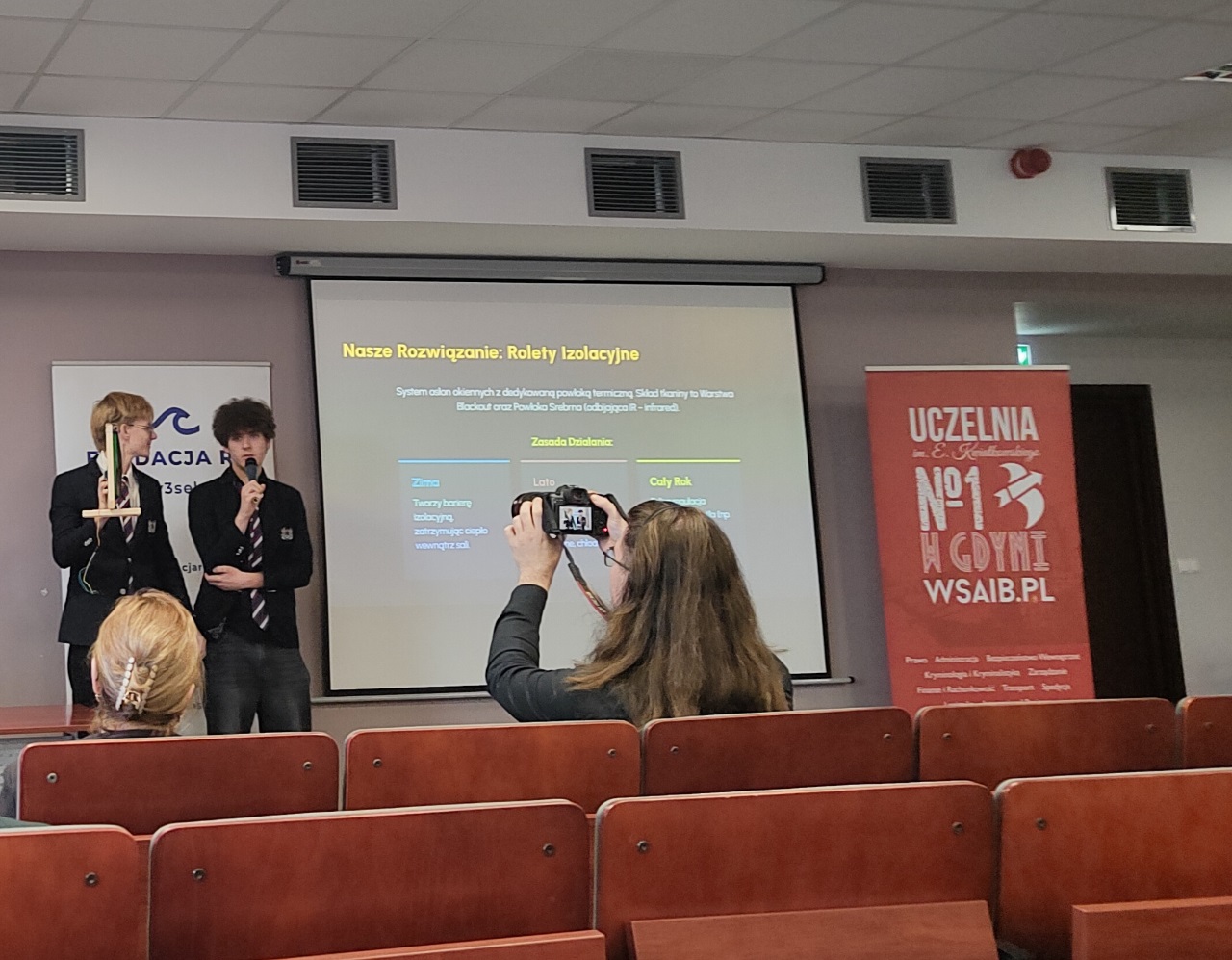Podczas tego wydarzenia reprezentanci poszczególnych zespołów zaprezentowali swoje projekty , które zostały oceni o ne przez ekspertów z UG . Naszą szkołę reprezentowała grupa 13 uczniów z klasy 3b . P od opieką swojego mentora pana Wiktora Czyżów , doktoranta UG , przygotowali nowatorski projekt “Złota bariera” - rolety izolacyjne, których zastosowanie w klasach mogłoby przyczynić się do zmniejszenia strat ciepła . Projekt ten za jął zaszczytne 2 miejsce .