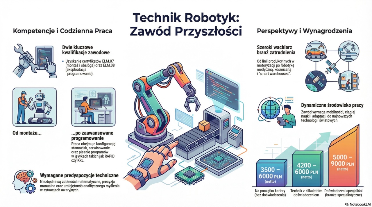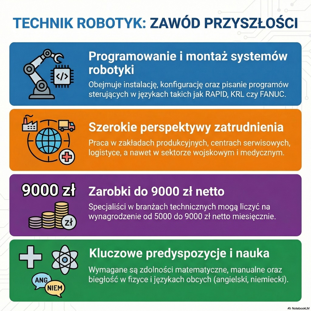 Profil technik robotyk przygotowuje do obsługi, programowania i diagnozowania systemów robotyki przemysłowej. Kierunek ten łączy zagadnienia z zakresu mechaniki, elektroniki i informatyki, przygotowując kadry techniczne na potrzeby nowoczesnego przemysłu i zautomatyzowanych linii produkcyjnych. Na tym kierunku nauczysz się programować maszyny i roboty, łącząc wiedzę z kilku dziedzin inżynierii. To idealna ścieżka dla osób, które chcą mieć bezpośredni kontakt z zaawansowanymi technologiami.