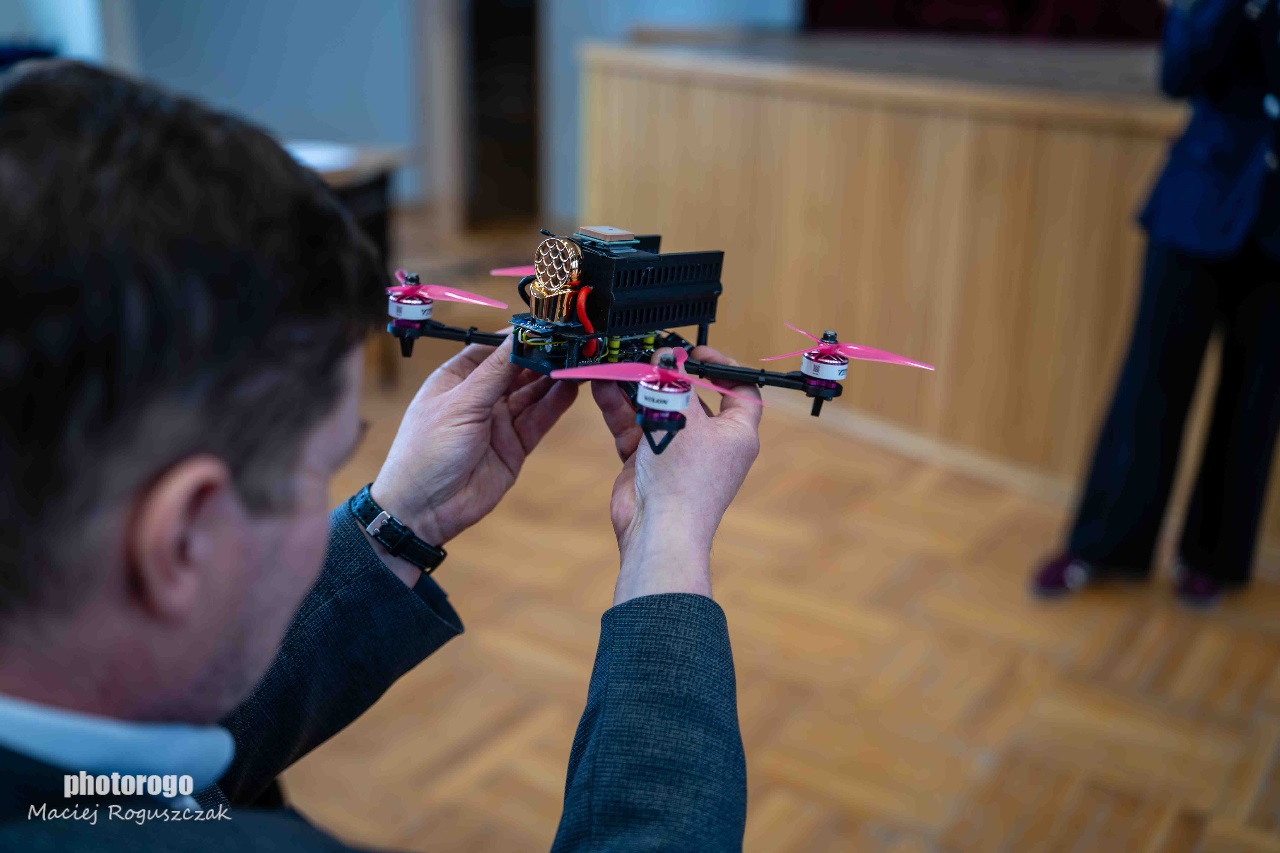 Autonomiczny system składa się z drona typu quadcopter oraz stacji dokującej umożliwiającej automatyczną wymianę akumulatorów, eliminując problem krótkiego czasu lotu. Dron samodzielnie ląduje, wymienia baterię i wznawia misję bez udziału operatora. Wyposażony jest m.in. w GPS, moduł komunikacji oraz kamerę wspierającą precyzyjne dokowanie, a jego konstrukcja została wykonana w technologii druku 3D. Stacja dokująca odpowiada za wymianę i ładowanie akumulatorów w czasie krótszym niż 60 sekund, zapewniając ciągłość pracy systemu. Rozwiązanie jest w pełni autonomiczne, skalowalne i może być wykorzystywane m.in. w ratownictwie, monitoringu oraz badaniach środowiskowych.