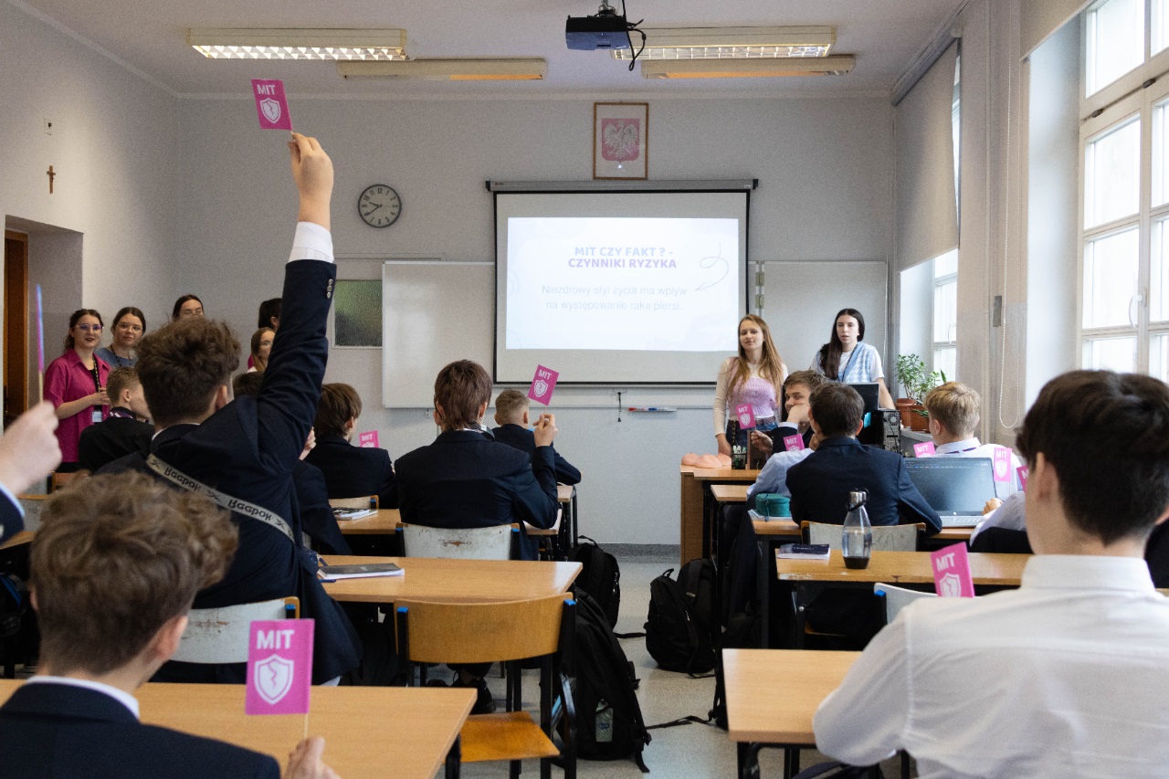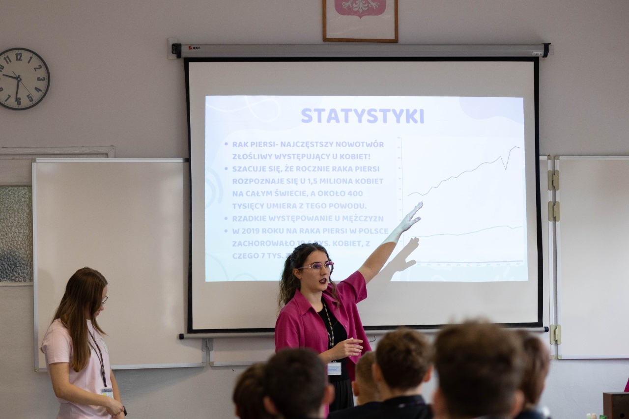 Podczas spotkania uczniowie zdobyli wiedzę na temat czynników ryzyka, symptomów mogących budzić niepokój oraz znaczenia wczesnego wykrywania nowotworów. Studentki GUMed przedstawiły również praktyczny instruktaż dotyczący prawidłowego wykonywania samobadania, podkreślając, że regularna obserwacja własnego ciała może uratować zdrowie, a nawet życie.